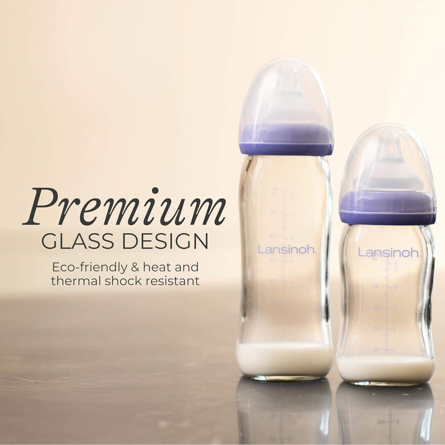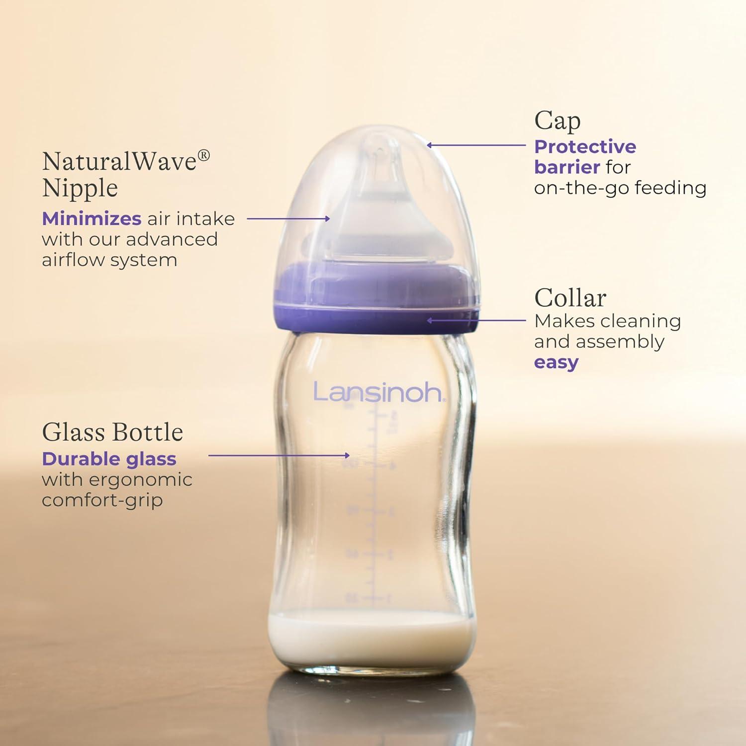 For every mom’s feeding journey – bottle feeding, breastfeeding, or both – Lansinoh's NaturalWave Feeding Bottles are designed for easy, comfortable feedings every time. Our ultra-soft and strong NaturalWave nipples feature a wide base and gradual slope that mold to your baby’s mouth, ensuring a secure latch that supports baby-led feeding. Clinically proven to reduce colic, our baby bottles have an advanced airflow system that minimizes air intake to help prevent gas, fussiness, and spit up for smoother, more harmonious feedings. Made from durable borosilicate glass designed to withstand extreme temperature changes and resist thermal shock, our premium glass bottles are safe for your baby and the environment. Cleanup is a snap –– Lansinoh bottles are dishwasher-safe and have just three pieces (excluding cap) for easy cleaning and assembly, giving you more time to enjoy those special moments with your little one.